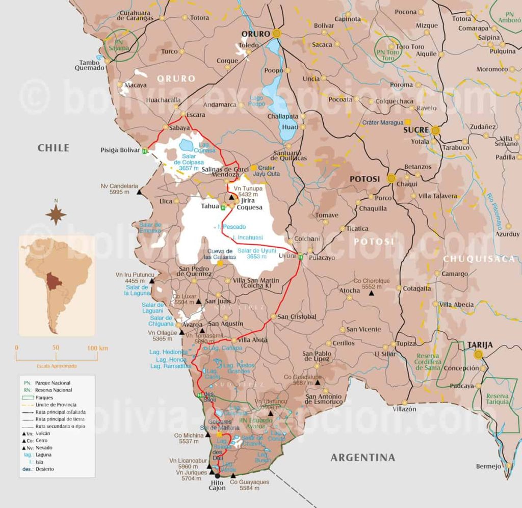 DISTANCES et DURÉES : 47 km de goudron / 1 heure de San Pedro au Hito Cajón. 110 km / 4 heures du Hito Cajón à la Laguna Colorada, enfin à nouveau 45km/1 heure pour atteindre le désert Ojo de Perdriz.